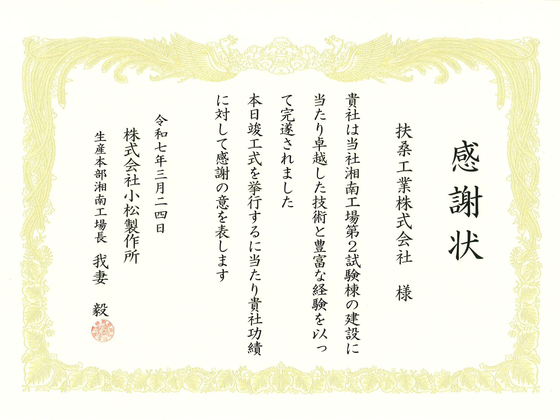 コンテンツ CONTENTS ホーム コンテンツ 株式会社小松製作所 生産本部湘南工場長 我妻毅様より 2025.03.24 株式会社小松製作所 生産本部湘南工場長 我妻毅様より 感謝状・表彰状 一覧へ戻る